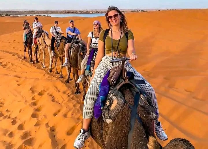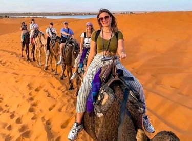 Laissez-vous bercer par le rythme tranquille de votre monture tandis que vous traversez des dunes dorées et des paysages infinis baignés de lumière. Cette excursion est une véritable immersion dans la culture du désert, où vous pourrez admirer un coucher de soleil spectaculaire, écouter le silence envoutant du Sahara et ressentir l’âme des anciens voyageurs.