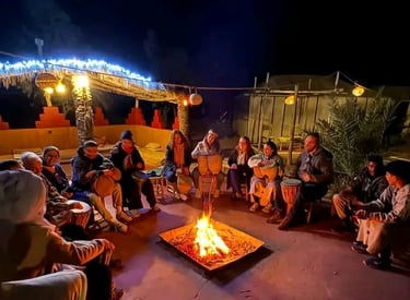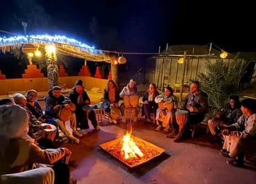 At dawn, wake up to witness the first light of day, followed by a traditional Moroccan breakfast. Then, depart for an immersive hike through the dunes, accompanied by camels carrying the equipment and supplies. In the evening, set up camp for the night. Enjoy a social evening around the fire with traditional music and relaxation under the stars.