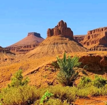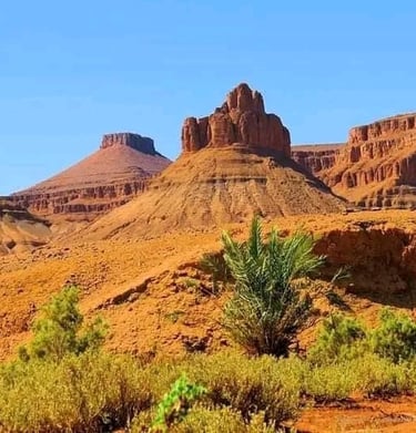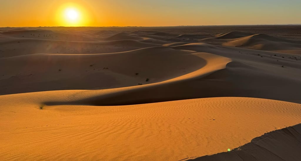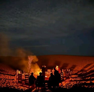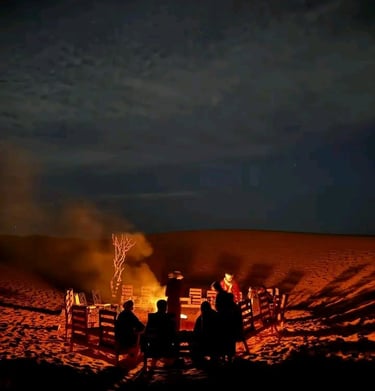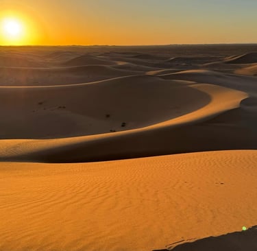 Dans l’après-midi, départ en 4x4 depuis Foum Zguid pour une traversée du parc national d’Iriki. Ce périple offre un panorama exceptionnel sur des plaines désertiques et des formations rocheuses impressionnantes, surnommées le "Colorado marocain". Arrivée aux premières dunes de l’Erg El Mhazil où le bivouac sera monté. Profitez d’un magnifique coucher de soleil avant de partager un dîner chaleureux autour d’un feu de camp sous un ciel étoilé. Nuit en plein désert, bercée par le silence des dunes.