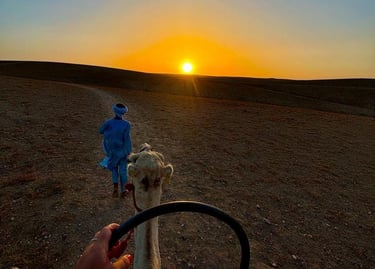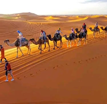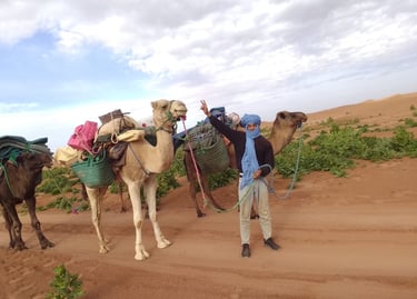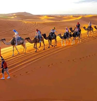 Dès l’aube, réveil pour contempler les premières lueurs du jour, suivi d’un petit-déjeuner marocain. Ensuite, départ pour une randonnée immersive à travers les dunes, accompagnés de dromadaires qui transporteront le matériel et les vivres. En fin de journée, installation du camp pour la nuit. Soirée conviviale autour du feu, avec musique traditionnelle et détente sous les étoiles.