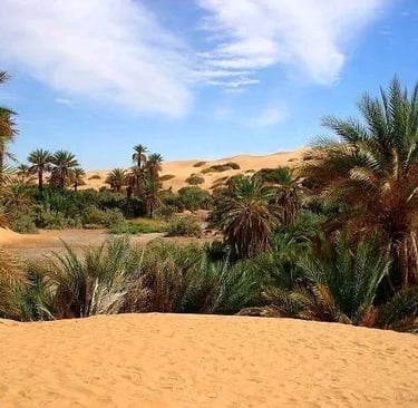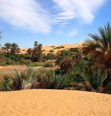 Randonnée vers l’oasis El Grisim, un véritable contraste avec l’environnement aride qui l’entoure. Ici, la verdure et la source d’eau apportent une atmosphère apaisante. Profitez de ce cadre unique pour découvrir le mode de vie des nomades, notamment la préparation du pain de sable et l’art du thé. Nuit sous tente ou à la belle étoile, bercé par la douceur du désert.